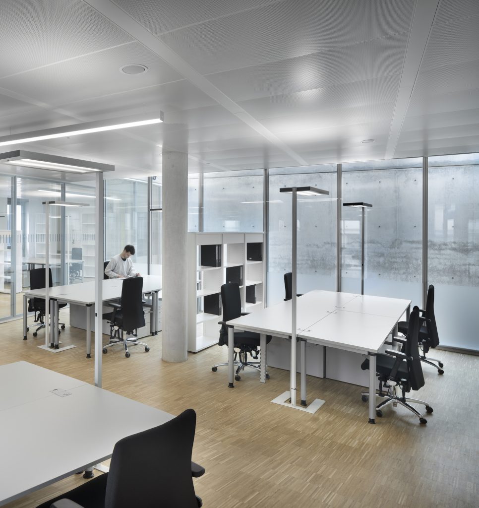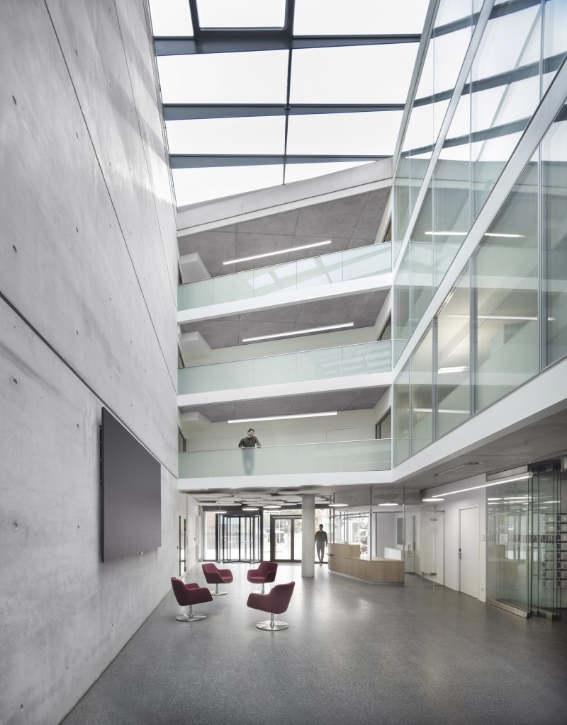 A central atrium connects all levels and allows generous amounts of daylight to flood in through the glass roof. Transparent facades and open floor plans promote visual connections and collaboration between disciplines.