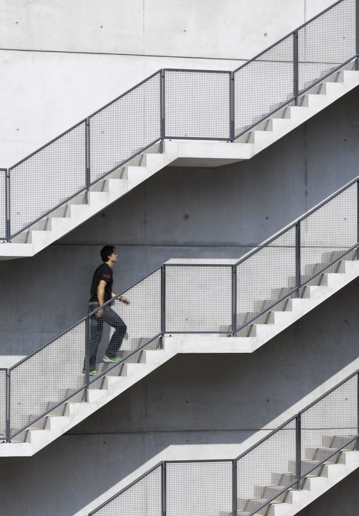 Der zweite Baukörper stellt durch seine mäanderartige, gefaltete Struktur eine räumliche Verbindung zur Gebäudegruppe eines benachbarten Wohnheims her. Das Prinzip der Faltung ist prägende architektonische Strategie. Ein scheinbar unendliches, in der Horizontalen wie auch der Vertikalen gefaltetes Band erzeugt auf spielerische Weise offene und geschlossene Strukturen.