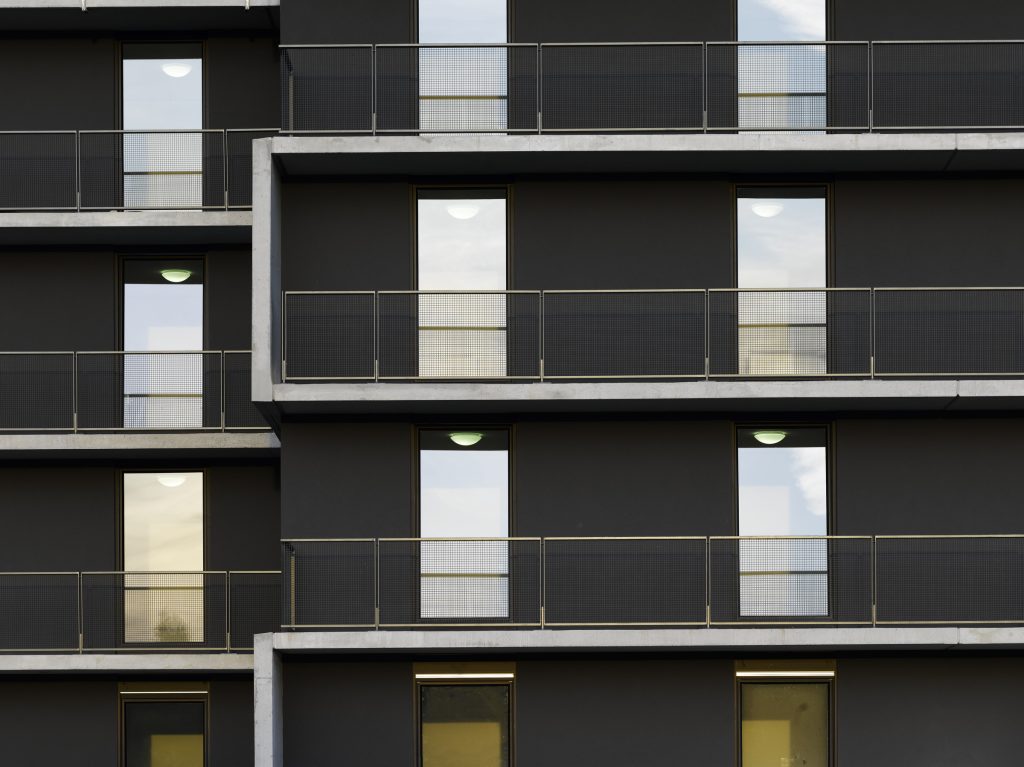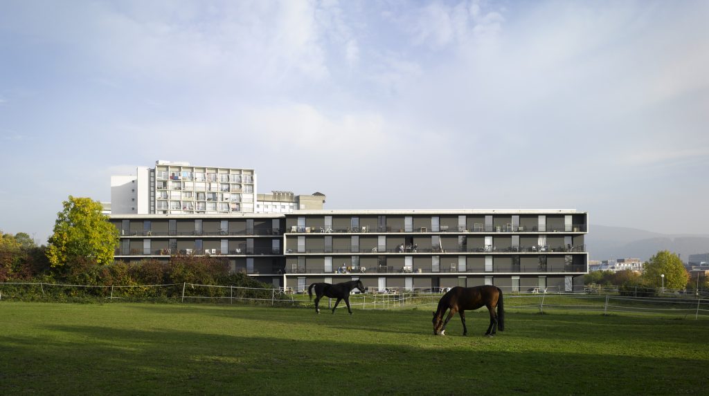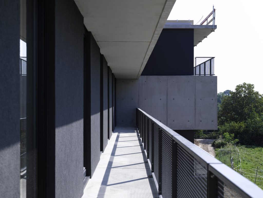 Zwei terrassierte, jeweils drei- bis viergeschossige Gebäude fügen sich zu einem kompakten Wohnkomplex zusammen: Der erste längliche Baukörper im Westen bildet einen städtebaulichen Abschluss des Ensembles.