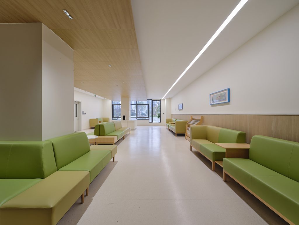Geschwungene Formen, wellenförmige Boden- und Wandmuster sowie natürliche Materialien prägen das Gestaltungsthema des Wassers als Symbol für Bewegung, Erneuerung und Heilung. Holzelemente und Möblierung in warmen Farbtönen verleihen den Aufenthaltsbereichen und Patientenzimmern eine wohnliche, beruhigende Atmosphäre.